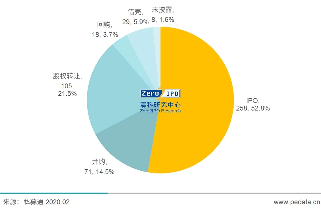 凭证清科研究中心《2020中国医疗器械行业投融资剖析报告》,,,,2014-2019年,,,,中国医疗器械行业退出案例数共488笔,,,,退出金额共501.0亿元。。。。。。。其中,,,,IPO退出258笔,,,,占总退出案例的52.8%,,,,退出金额达347.37亿元,,,,占总退出金额的69.3%;;;;;;其次是以并购的方法退出,,,,共71笔事务,,,,数目占比14.5%,,,,退出金额达83.19亿元,,,,占总退出金额的16.6%。。。。。。。