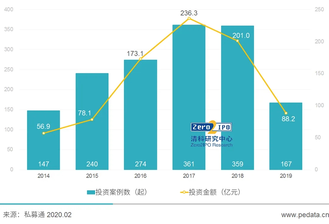 凭证清科研究中心《2020年中国医疗器械行业投融资剖析报告》,,,,2014-2019年,,,,中国医疗器械行业累计披露投资案例1548起,,,,披露投资金额833.6亿元。。。。。。。其中,,,,2017年是中国医疗器械行业投资大爆发的一年,,,,投资案例数、投资金额双双抵达历年峰值,,,,其中披露投资案例361起,,,,同比增添31.8%,,,,投资金额达236.3亿元,,,,同比增添36.5%。。。。。。。2018年,,,,随着投资市场逐渐趋于理性,,,,投资者在对投资标的的选取上变得审慎,,,,越发倾向于投资真正具备手艺壁垒的立异企业。。。。。。。受整体经济情形的影响,,,,2019年中国医疗器械行业投资显着下滑,,,,披露投资案例数和投资金额划分同比下降了53.5%、56.1%。。。。。。。