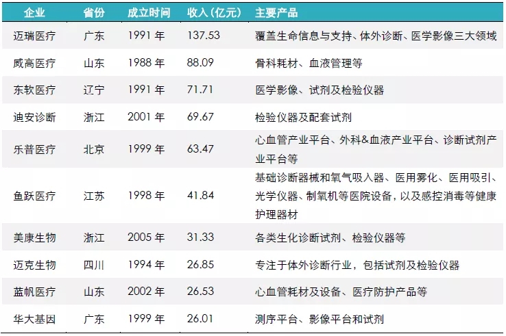 整体来看,,,,中国生长活跃的医疗器械企业相对集中在东部沿海地区,,,,平均建设时间一样平常凌驾20年,,,,主要产品集中在体外诊断制剂及磨练仪器、医学影像等细分领域。。。。。。。凭证果真数据,,,,2018年,,,,中国医疗器械企业TOP10总营收为583亿元人民币,,,,占2018年中国医疗器械市场规模的11%,,,,远低于全球医疗器械市场44%的行业集中度。。。。。。。